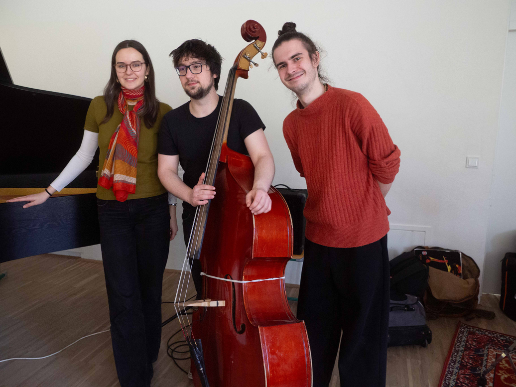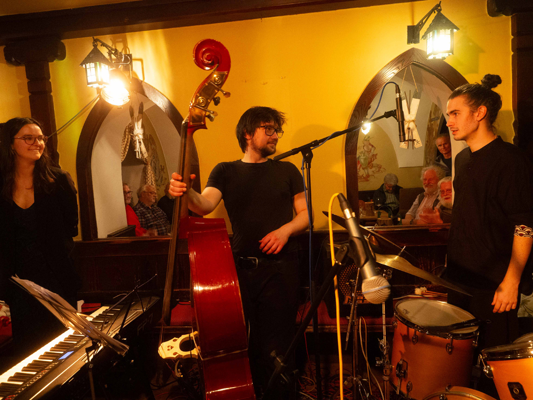 Mit geballter Energie und unglaublichem Können bestritten drei ganz junge MusikerInnen das vorerst letzte Konzert der Jazzfreunde im Weinhaus Attwenger. Simon Kirchner, gebürtiger Ebenseer, Schlagzeug-Student, beeindruckte mit Virtuosität und Kreativität. Seine Eigenkompositionen sind inspiriert vom Salzkammergut, vom Langbathsee oder dem Glöcklerlauf. Das Trio spielte wunderschöne Balladen, melancholische, schwebende Musik, getragen von der unfassbaren Virtuosität der jungen Kontrabassisten Tjan Šoštarič, der melodiöse Intros und Soli spielte, als wäre der Kontrabass mindestens ein Cello. Pianistin Katarina Kochetova, deren erstes Album gerade erschienen ist und das von einem italienischen Jazzmagazin unter die 100 besten weltweit des Jahres 2024 gereiht wurde, setzte solistische Glanzlichter und begleitete einfühlsam bei den Soli des Kontrabasses. Neben Eigenkompositionen aller drei Musiker standen auch einige Standards auf dem Programm, bei Herbie Hancock ging so richtig die Post ab, der Groove des klassischen Trios wie bei den großen amerikanischen Vorbildern sensationell. Und in der inspirierenden Atmosphäre vom Weinhaus Attwenger wurde sogar noch gejammt, Thomas Beitzke am Saxofon gab All Blues.