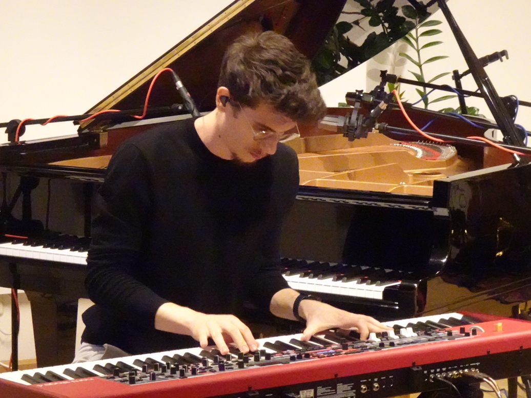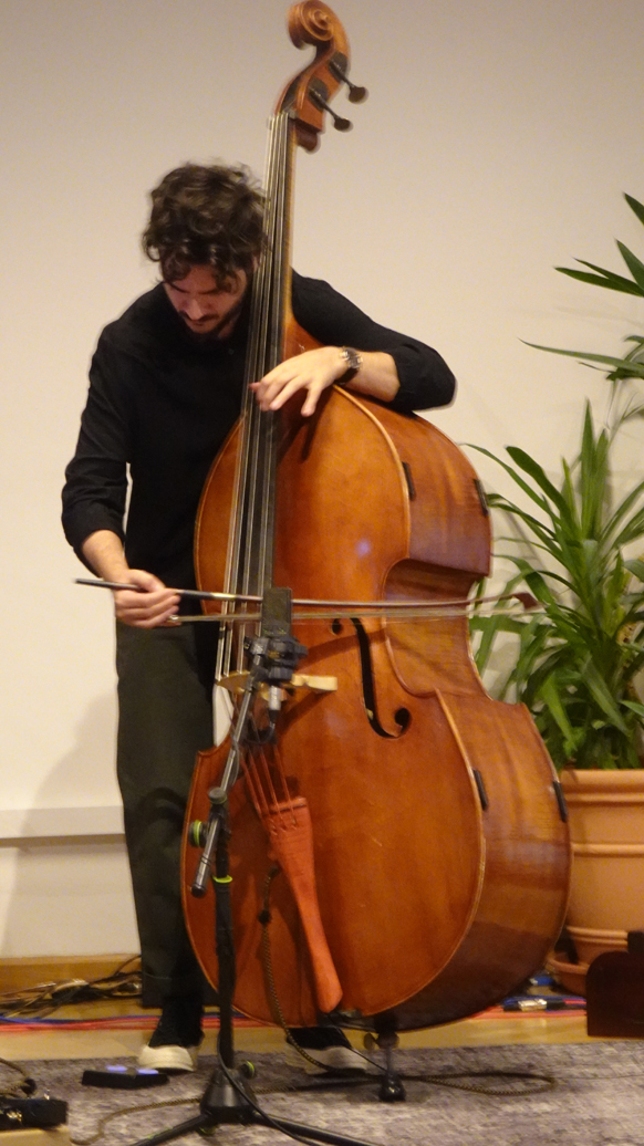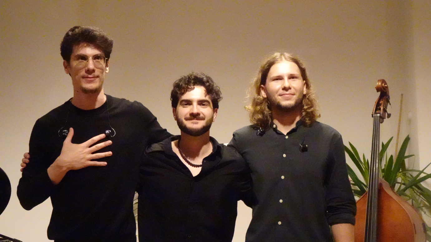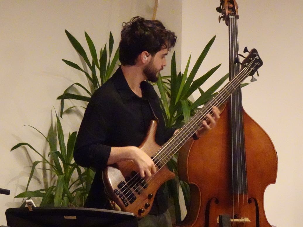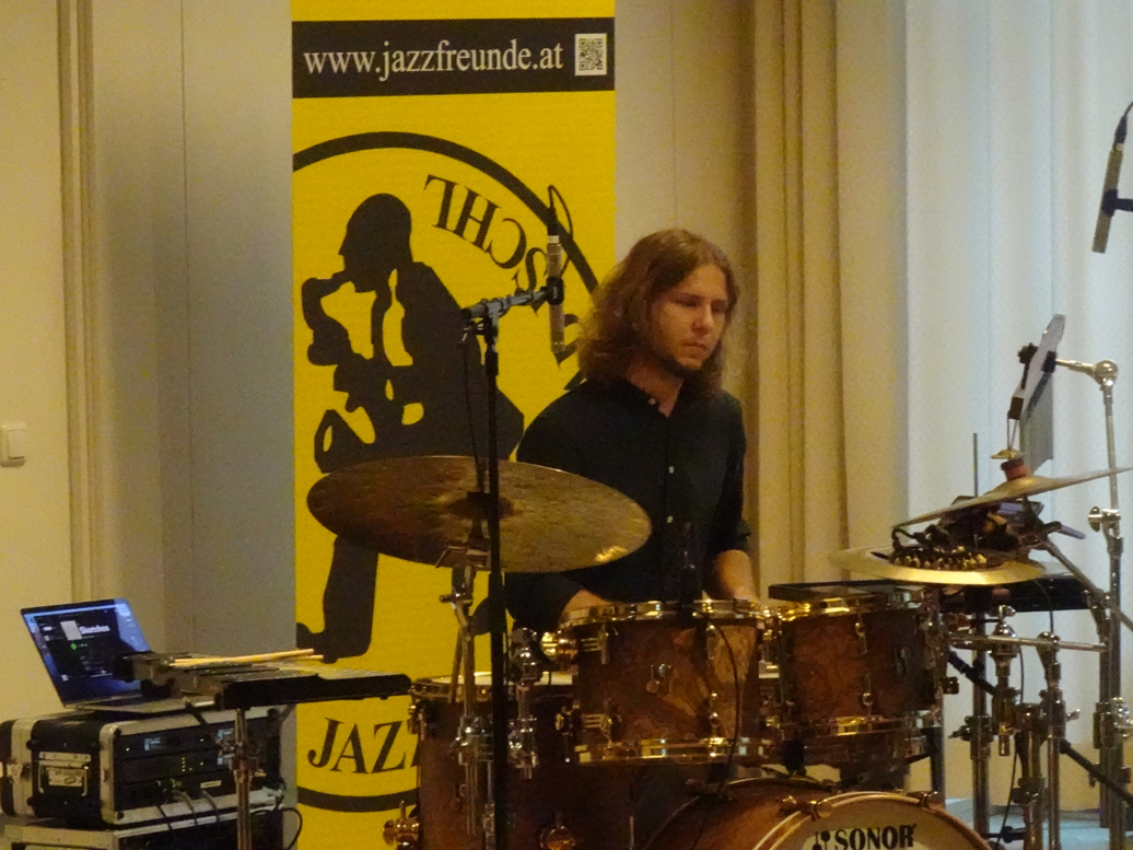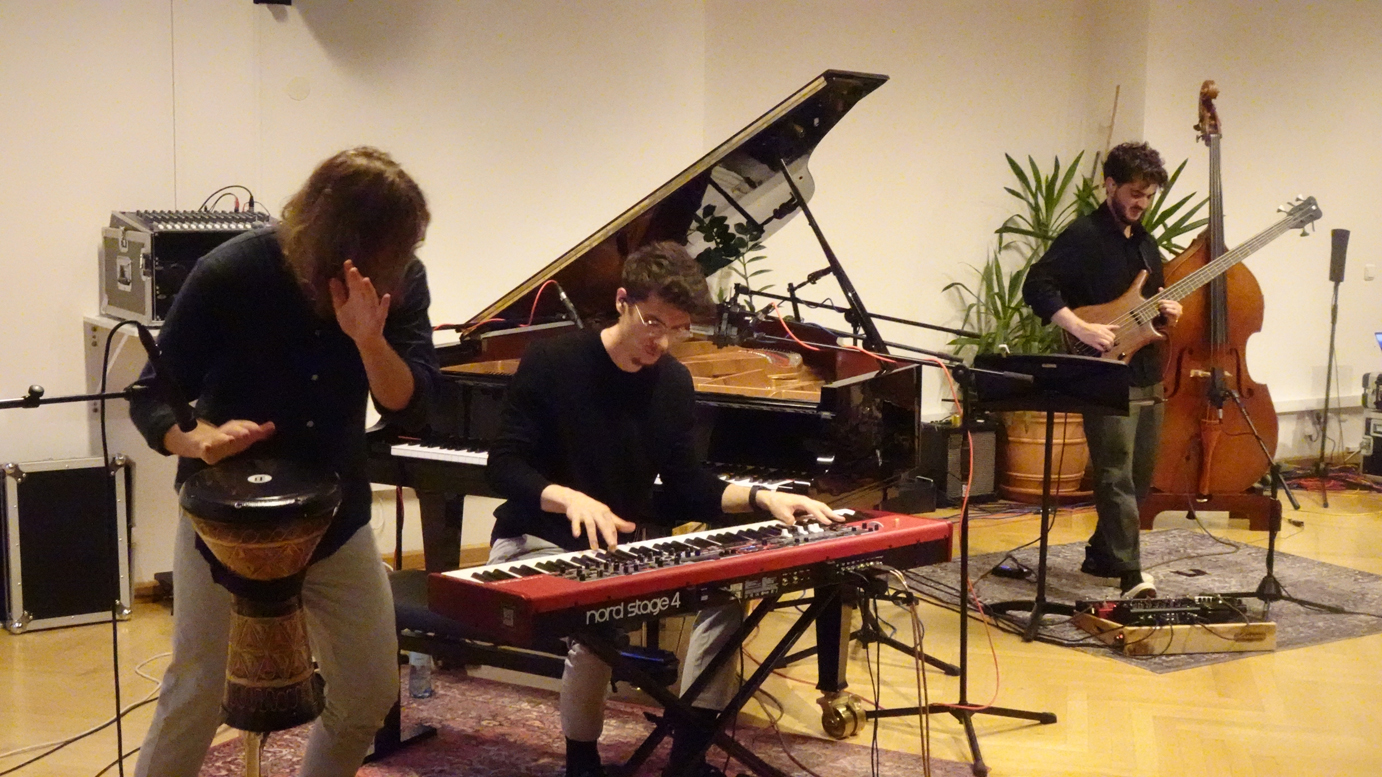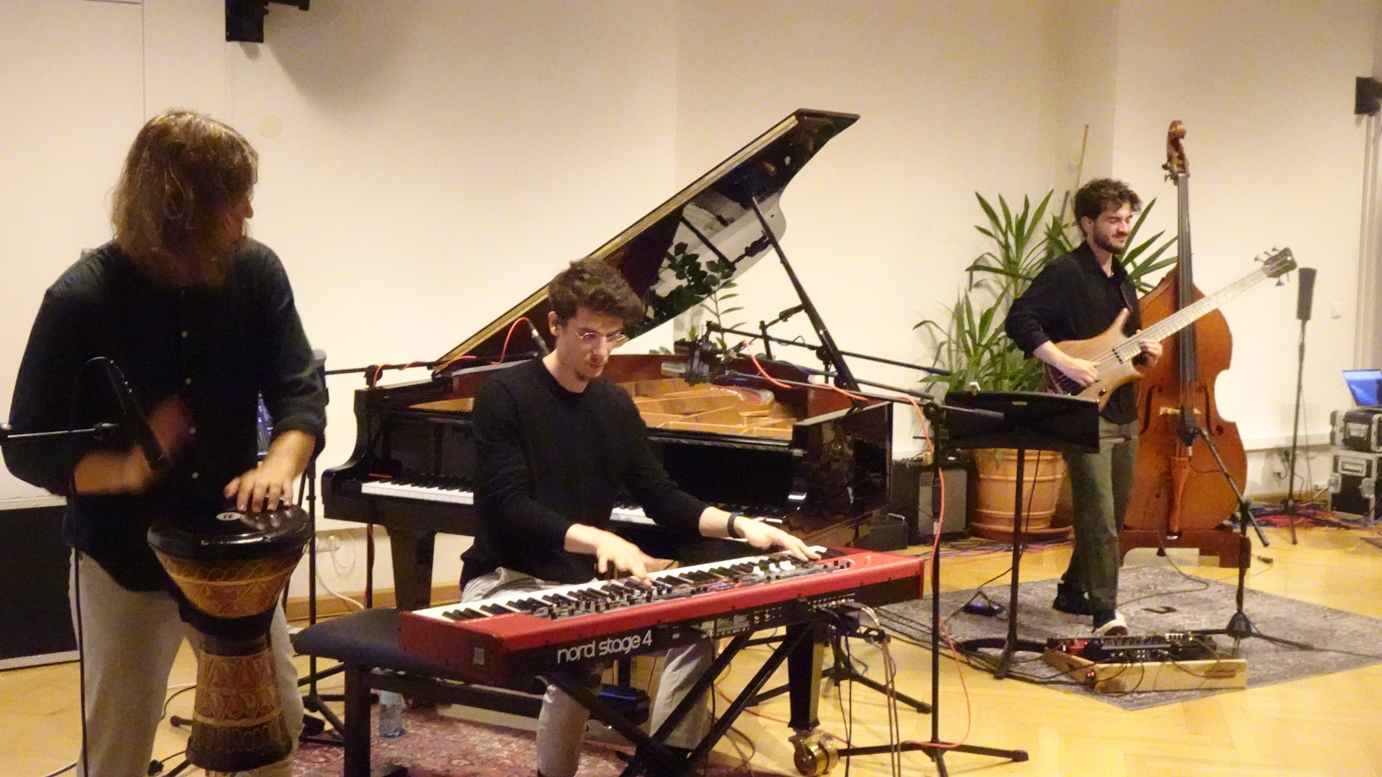 Amphitrio – die drei jungen Rumänen Andrei Petrache an den Tasten, Mike Alex am Bass und Philip Goron, drums klangen nicht wie ein Trio sondern mindestens wie ein Sextett. Nur drei Leute und so eine unglaublich abwechslungsreiche Performance! Die Stücke klangen stilistisch ganz unterschiedlich, durchgecheckt und ausgetüftelt bis ins Detail, von besinnlicher Ballade bis zu Heavy Rock. Andrei Petrache bediente neben dem Flügel auch ein Keyboard und entlockte ihm schräge Sounds, die jedem Stück einen unverwechselbaren Charakter verliehen. Die meisten Kompositionen stammten von Andrei Petrache, er ließ sich auch von Bela Bartok und rumänischen Volksliedern inspirieren – alle mit ungeraden und ungewohnten Taktarten. Die drei Musiker konnten ihre Virtuosität und Kreativität voll ausspielen.