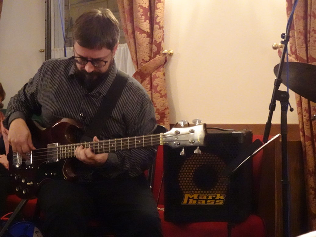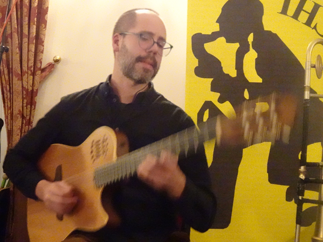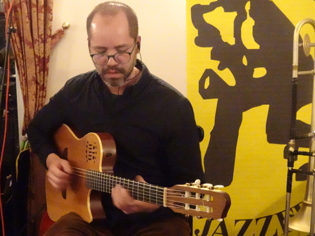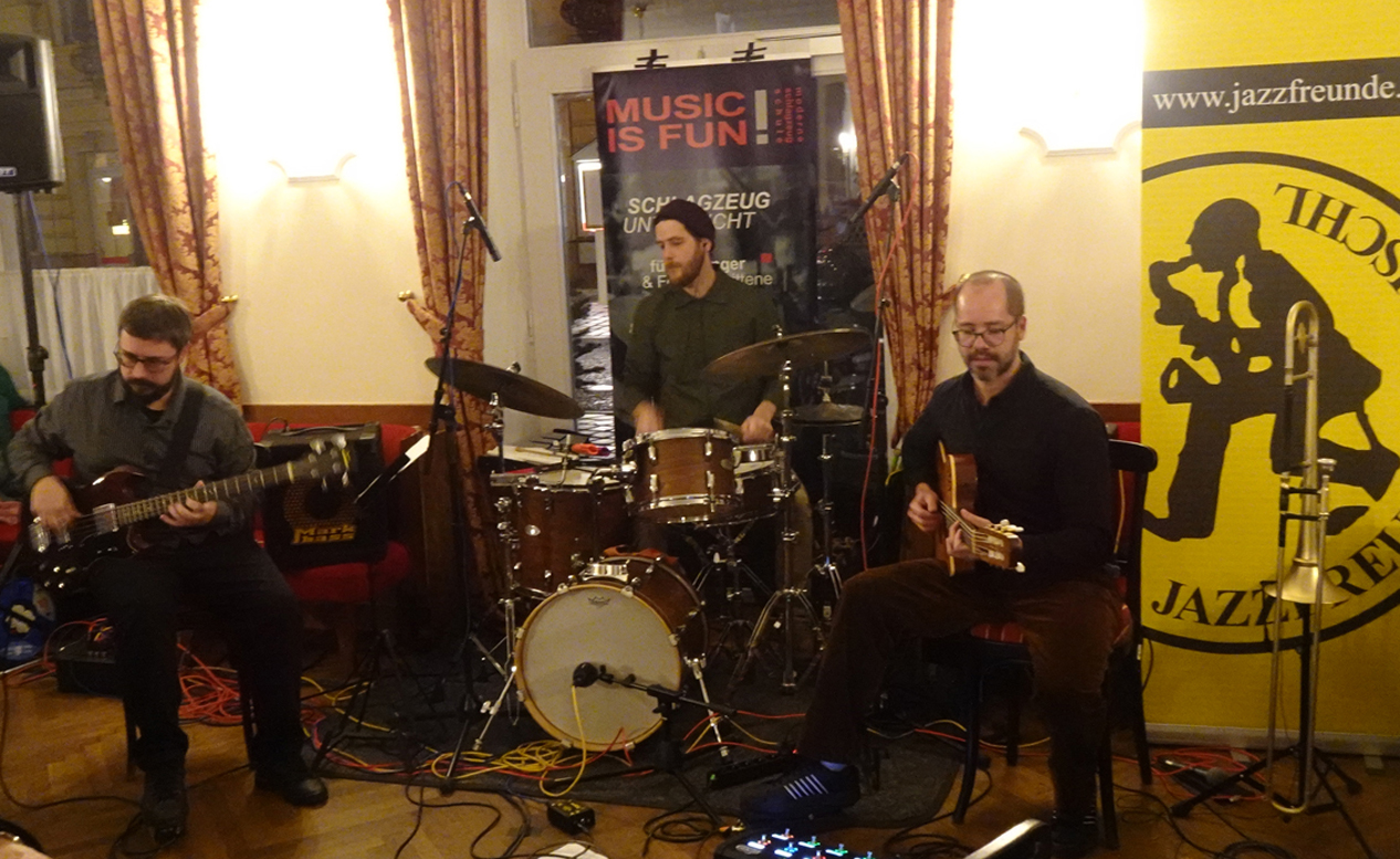In intimer Wohnzimmeratmosphäre war das neugierige und aufmerksame Publikum ganz nah dran an den drei brasilianischen Virtuosen Emiliano Sampaio (guitar, trombone), Gustavo Boni (bass) und Luis Oliveira (drums). 2004, mit 18 Jahren, haben die drei das Trio gegründet, und alles gespielt von Jazz und Rock zu eigenen Kompositionen und traditioneller brasilianischer Musik. Diese Mischung war auch im Ramsauer zu hören, brasilianische Classics aus verschiedenen Regionen Brasiliens, aus der Zeit von 1890 bis 1950, die in Europa völlig unbekannt sind, und eigene Kompositionen. Meretrio spielt mit der feinen Klinge, dezent und nuanciert, höchst virtuos mit Gitarre und Bass und einem wunderbar sonoren Posaunenklang samt special effects (loops). Man hört, dass sie schon über 20 Jahre miteinander spielen, heuer sind sie international auf Tournee und spielen 50 Konzerte in der „20 Years European Tour“.  Lauter schöne Nummern, zwischen Samba -Vorläufern mit viel groove, und leisen Balladen mit viel feeling, und einer sehr virtuosen Zugabe mit drei Tamburinen.