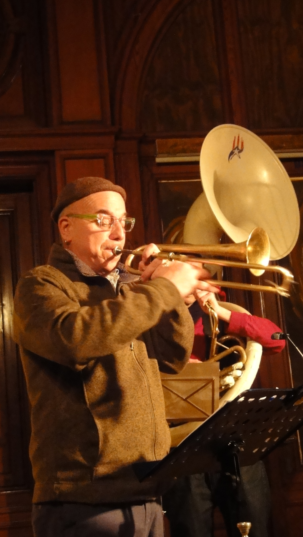 Mit seiner Pocket Brass Band gastierte er auf Einladung der Jazzfreunde in der PKS-Villa - virtuos, teils schräg, teils irrwitzig (Quietsche-Tierchen als Percussion-Instrument).