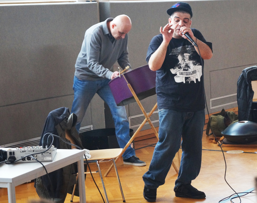 Dabei war das Programm alles andere als gewöhnlich und die 50 Minuten einer Unterrichtseinheit verflogen wie im Flug. Zum Staunen, Bewundern und immer wieder zum Totlachen brachten die Geräuschimitationen und Stimmeffekte von Nino G das Publikum. Denn wenn ein Hubschrauber im Turnsaal donnert, ein womöglich illegal umgebauter Auspuff eines Motorades brummt, eine lästige Fliege sich bemerkbar macht oder ein Baby schreit, ist der Beatboxer in seinem Element. Nase, Mund, Zunge, Zähne, Rachen und Bauch sind seine Instrumente und mit diesen entführte er in seine eigene Geräusch- und Klangwelt. Ninos Partner Reto Weber erläuterte den Begriff Beatbox, stellte einige Schlagzeug-Instrumente aus aller Welt vor und trieb die Stimmimprovisationen des Beatboxers rhythmisch voran. Dazu durften die jungen Menschen selber mit ihren Stimmen experimentieren: ein spannendes und amüsantes Erlebnis für alle Beteiligten.