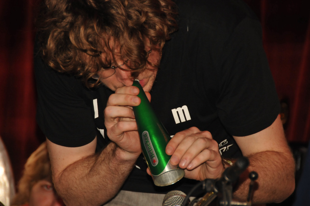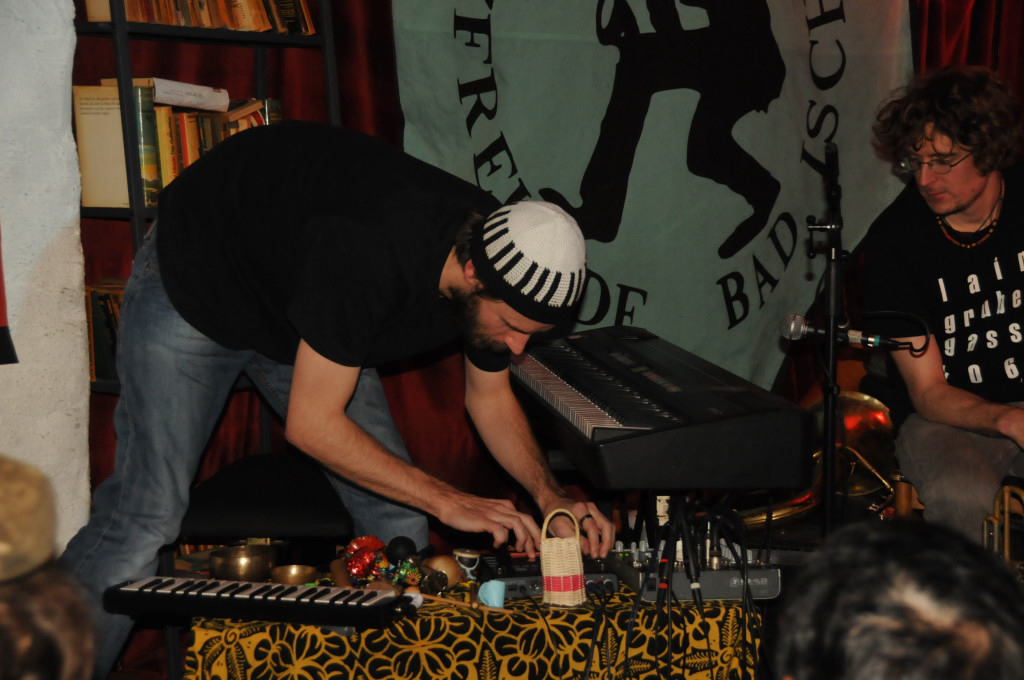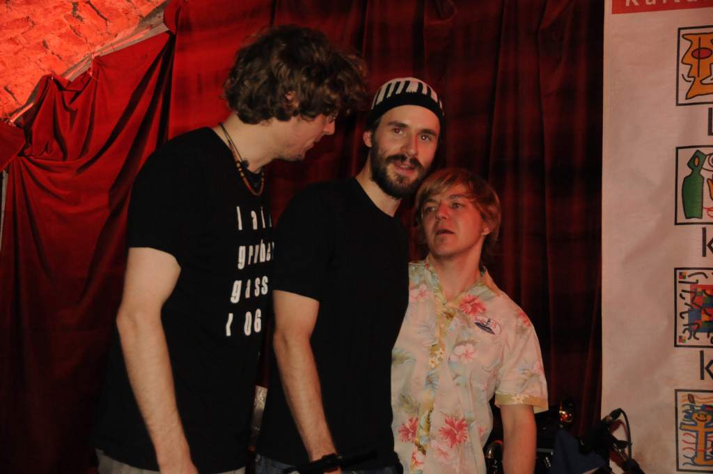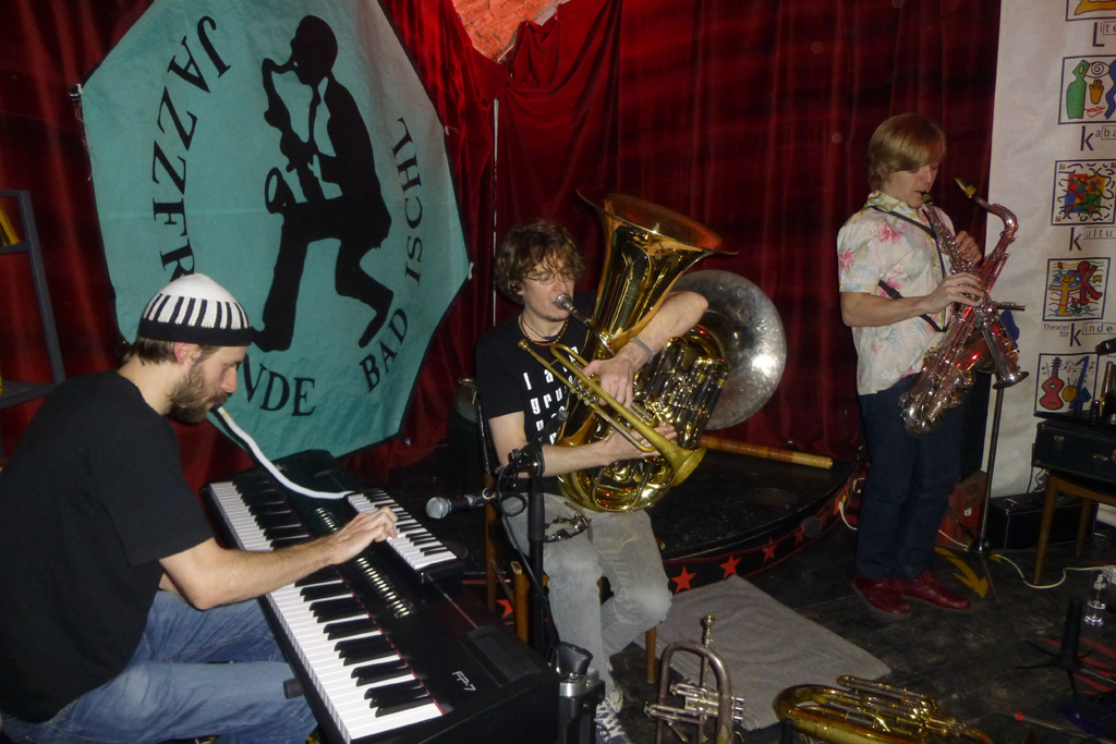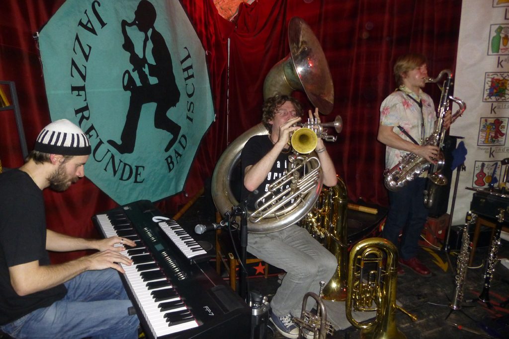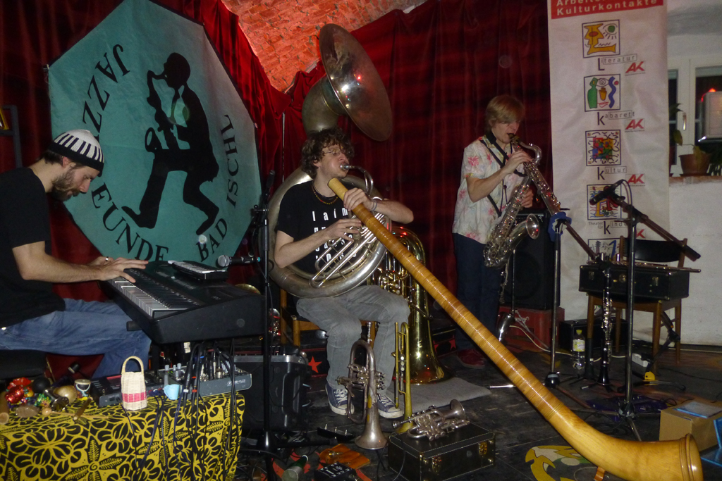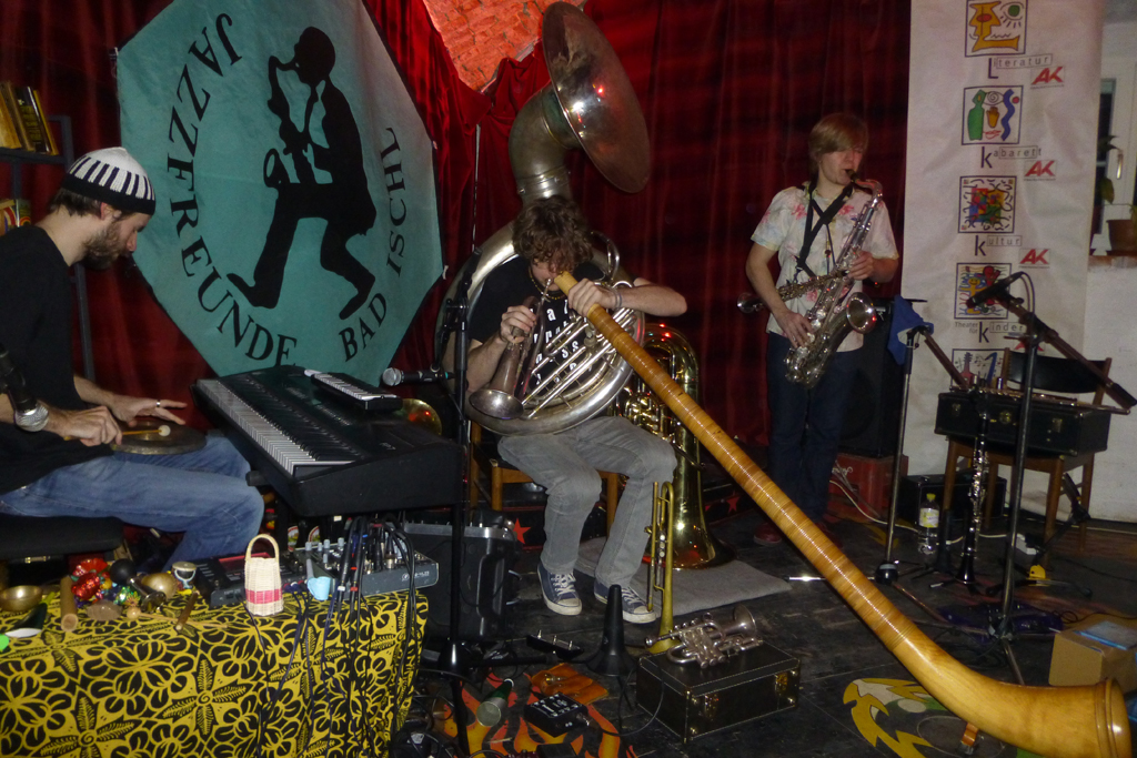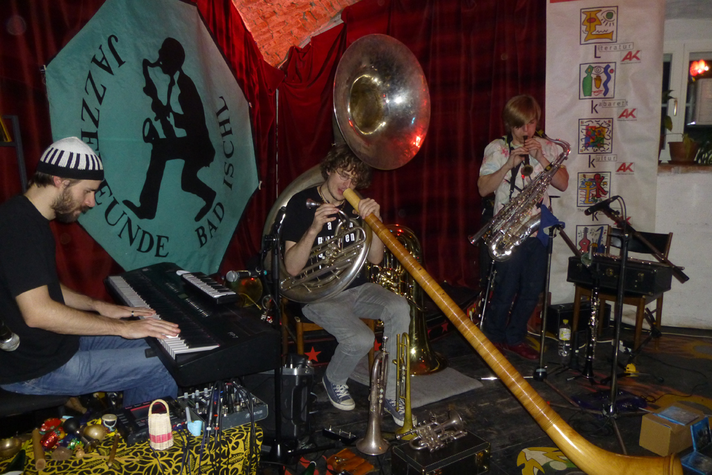 Tatsächlich stand dann dort ein Trio: "David Helbock's Random Control". Die jungen Vorarlberger (Bandleader Helbock war zwei Tage vor dem Ischl-Auftritt 30 geworden) hatten jedoch nicht umsonst derart aufmagaziniert: In manchen Momenten spielten die drei bis zu sechs Instrumente gleichzeitig - das konnte ein Saxophon ebenso sein wie eine Heineken-Flasche (oder Beat box-Tuba, Faschingströterl, mit Wasser gestimmte Bierflaschen, Luftballons usw.). Es war teils wirklich witzig, wie sich das Trio auf der Bühne gebarte, und dennoch war es weit weg von jedwedem Klamauk.