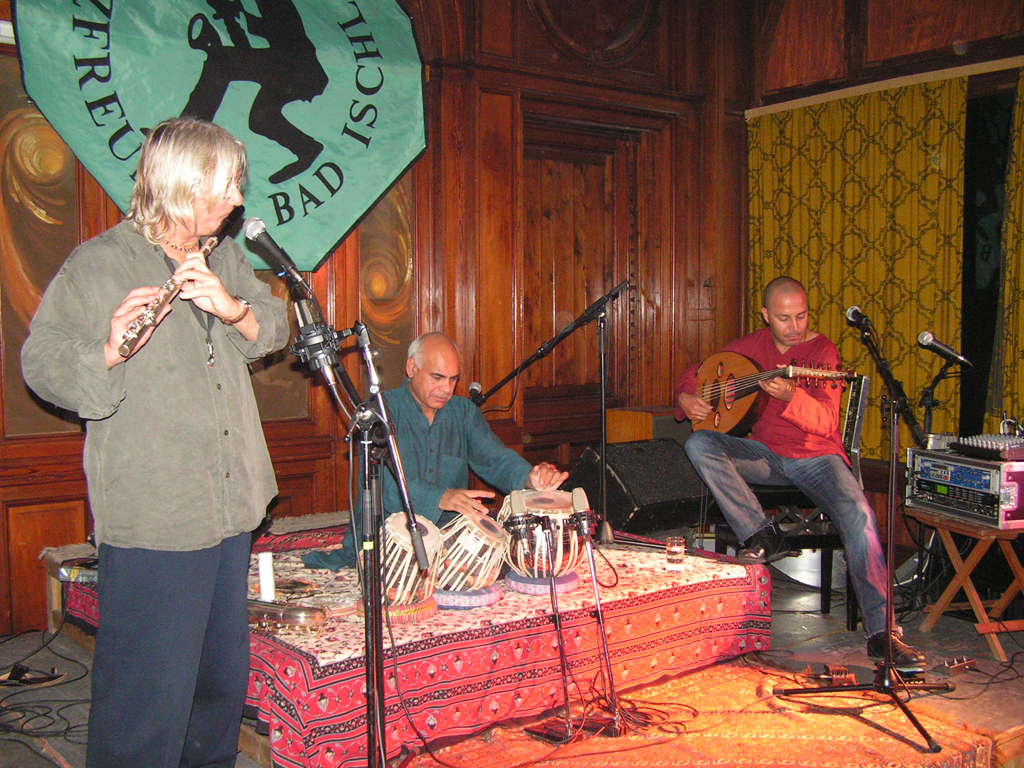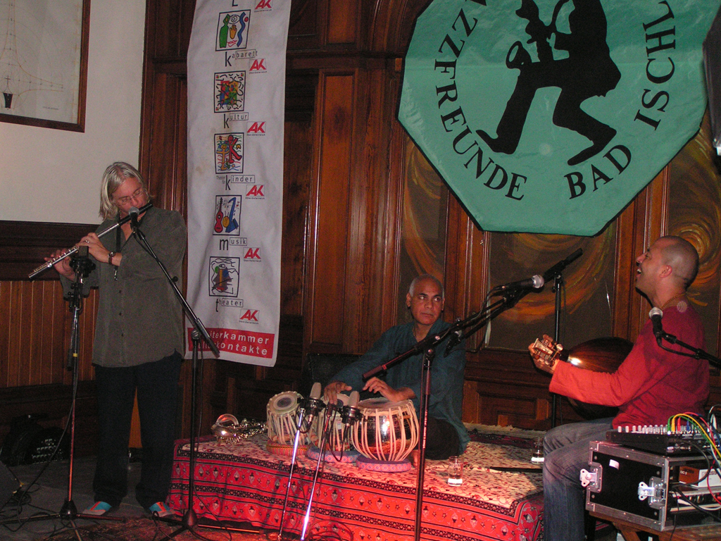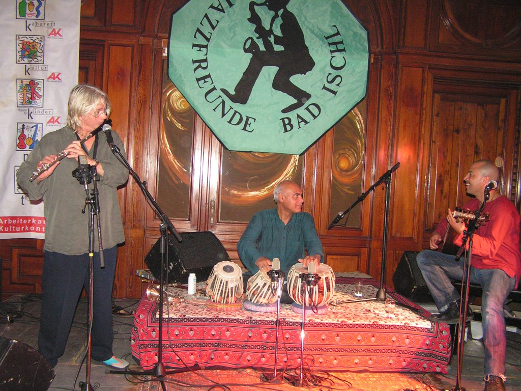 Drei Kosmopolitische Musiker waren am Donnerstag von den Jazzfreunden Bad Ischl in die PKS-Villa zum instrumentalen und vokalen Palaver geladen. Dhafer Youssef kommt mit seiner Oud, der laute ähnlich, aus Tunesien. Gelegentlich lässt er zu seinen exotischen Melodiebögen den geheimnisvollen Kopfstimmengesang hören. Jatinder Thakur schlägt die indische Tabla mit insistierender Dichte. Aus der Welt der Jazzkultur bläst Wolfgang Puschnig mit Biss und Schärfe Altsax und Flöte. In der Harmonie ihres Zusammenspiels nähern sie sich in Melodie und Rhythmik. Sie umkreisen sich improvisierend, bleiben aber immer ihrer Herkunft verbunden. Es ist wie ein Gespräch unter Freunden, die sich gegenseitig von den Schönheiten der Welt erzählen.