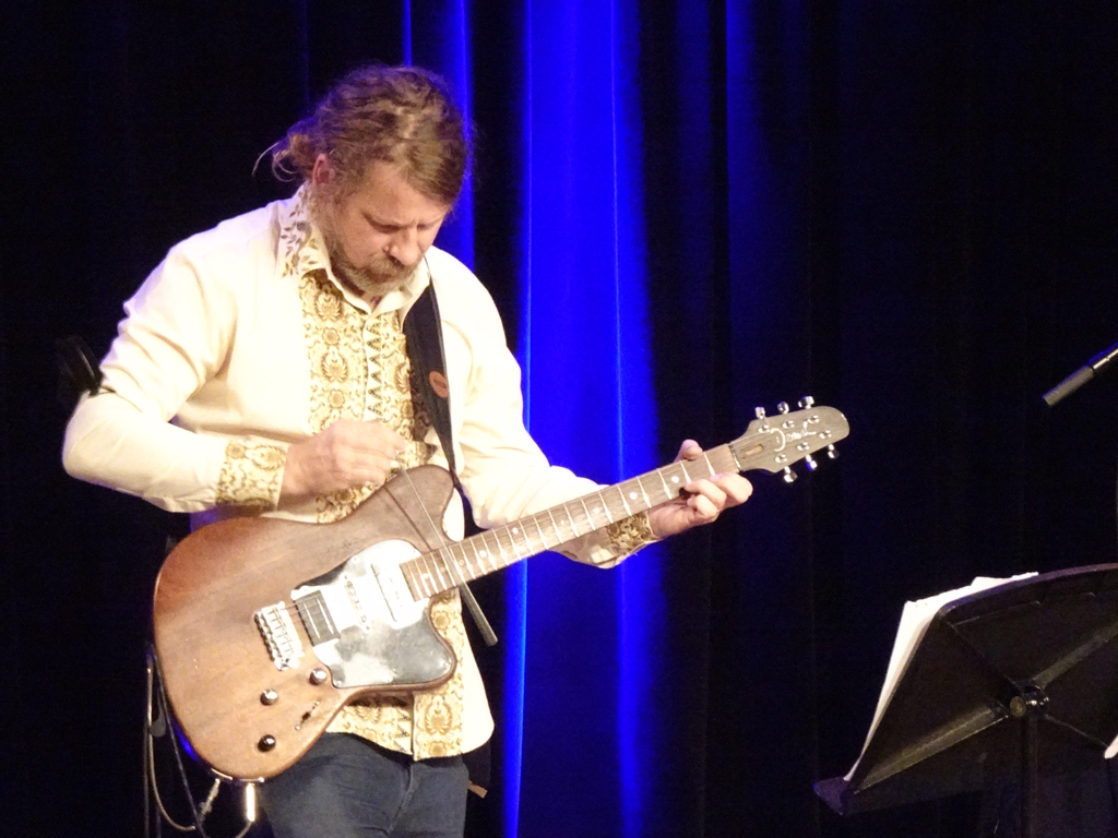 Mit sphärischen Klängen, verfremdeten E-Gitarren-Sounds und wilden Soli entführten uns Kalle Kalima und Oliver Steidle in die „unendlichen Weiten des Weltraums.“ Reminiszenzen an etwas Bekanntes blitzen im Hintergrund auf, aber sofort heben die Kompositionen ab, mit Augenzwinkern, und wirklich einer Portion finnischer Verrücktheit. Entfernt hörbar ist ein Country-oder Blues-Song, zu dem es aber nie wirklich kommt; oder ein tapsiger, ungelenker finnischer Tango; ein Bezug auf Jean Sibelius; dazwischen jede Menge Weltraumausflüge mit verrückten Klangeffekten, zu Sirius A oder Planet 5. Kalle Kalima hat auf der Gitarre alle Möglichkeiten und Stimmen, der Mann kann alles: fetzig, abgehoben, spacig, virtuos, modern, advanced, explosiv, schräg, rockig, und auch nachdenkliche und ganz leise Töne. Oliver Steidle am Schlagzeug hält immer mit vertrackten Rhythmen dagegen. Er ist nie nur Begleitung sondern der „Gasgeber“, der Kalle pusht und ganz eigenständig variabel agiert. Das funktioniert nur, weil die beiden schon seit 20 Jahren zusammen spielen. Kalle Kalima führt launig durch das Konzert, das trotz Corona-Auflagen zahlreiche und sehr disziplinierte Publikum dankte mit größter Begeisterung.