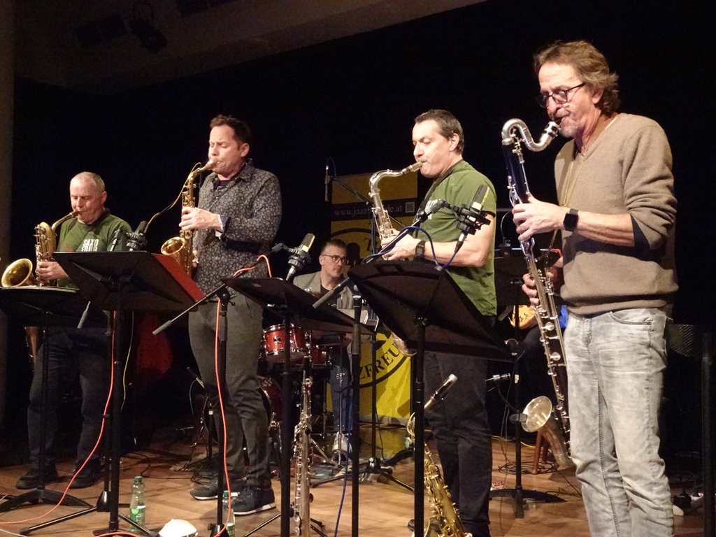 Das Konzert von Saxofour durfte statt im November am 28. Dezember doch stattfinden – mit allen Auflagen – und es wurde ein voller Erfolg! Viel Publikum, viel Schmäh und gute Stimmung ergaben einen fulminanten Konzertabend. Seit 30 Jahren sind Saxofour auf der Bühne und verwöhnen ihr Publikum mit ungebrochener Qualität. Die Arrangements haben sich geändert, denn aus 4 wurden 6 – die vier Saxofonisten unterstützt durch swingende und treibende Grooves von Wolfi Rainer an den Drums und Robert Riegler am Bass. Auch bei den Saxofonen gab es eine Besetzungsänderung, neben Florian Bramböck, Klaus Dickbauer und Christian Maurer spielte Andreas See. Sie brillierten mit coolen Arrangements des Saxofonsatzes und mitreißenden Soli, garniert mit einer Portion Schmäh und Augenzwinkern. Der Spaß und die Ideen gehen ihnen nicht aus, und wir freuen uns auf die nächsten 30 Jahre!